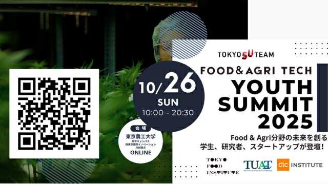 食の未来を考え、新しい事業構築・人材育成、さらには社会の多様なアクターの共創によるエコシステム構築を目指す一般社団法人TOKYO FOOD INSTITUTE(所在地:東京都中央区、代表理事:沢 俊和、以下「TFI」)と、政府・地方自治体・大学などと連携し、エコシステムの発展とイノベーションを通じた経済成長に貢献するCIC Institute(所在地:東京都港区、創業者兼CEO:ティム・ロウ)は、東京農工大学と協働し、2025年10月26日(日)、全国の大学生を対象に、食と農業の未来を担う起業家人材を発掘・育成することを目的として「FOOD&AGRI FOODTECH Youth Summit 2025」を初開催いたします。