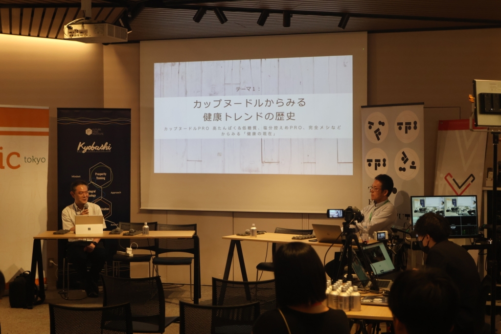 第一部は「食品企業開発者と大学食品科学者の融合から見る『健康』の未来」をテーマに、宮城大学食産業学群の石川伸一氏と、日清食品HLDグローバルイノベーション研究センターの瀬戸次朗氏が登壇。 日清食品の主力商品であるカップラーメンには2つの健康課題があるという。1つは消費者の健康意識。現在、カップラーメンの健康への取り組みは格段に進歩しているという。それでも「カップラーメンは体に悪い」、「健康とおいしさはトレードオフ」と考える消費者の価値観をどのように払拭していけばいいのかなどが議論された。2つ目は社会全体、環境全体の健康だ。日清では環境破壊や児童労働などの問題が取り沙汰されるパーム油を持続可能なものに変えるべく、調達先の変更や、酵母からパーム油を作る研究も行われている。また、企業研究だけでは限りがあるため、アカデミアとの共創が必要だと語られた。