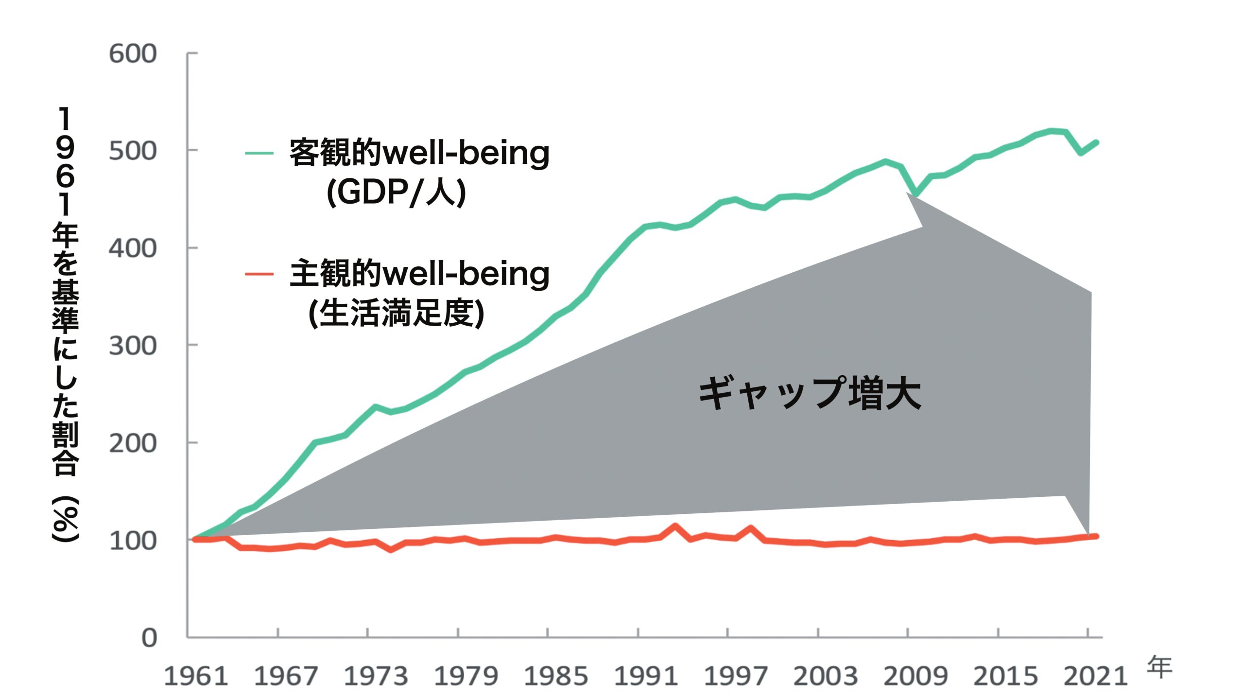 これは、従来の物質的な豊かさを表す「人工資本」に加えて、人の能力や健康などを示す「人的資本」、自然からの様々な恩恵である「自然資本」を、世代を超えたウェルビーイングを構成する要素とみなす。これらが世代を超えて与える金銭的価値を、主観、客観両方の指標から数値化するものである。この3つの資本の総量を高めることで、持続可能でウェルビーイングな社会を目指す時代がきている。