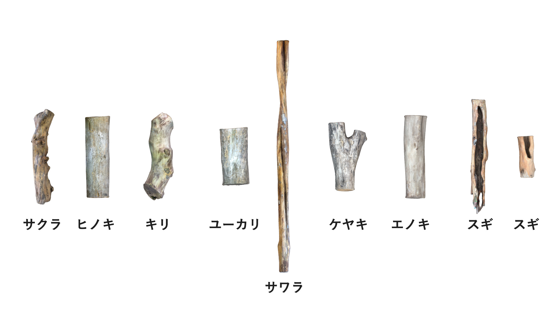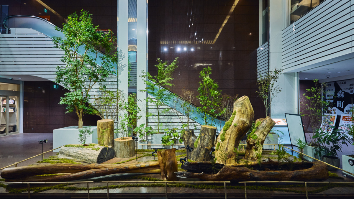 「雷に打たれた木、虫食いの木、2本が奇跡的に1本になってねじれてしまった木など、それぞれストーリーを持った木を選定しています。これらを枯山水の石のように見立てて配置し、苔の専門家であるジャパンモスファクトリーさん、微生物や再生型植物を研究するBIOTAさんと一緒に、再生の仕組みを作っています。ここで育った苗木をまた森に還せるよう、東京の捨てられるはずだった木から新しい命を都市空間で作って返す、というサイクルです」(秋吉氏)