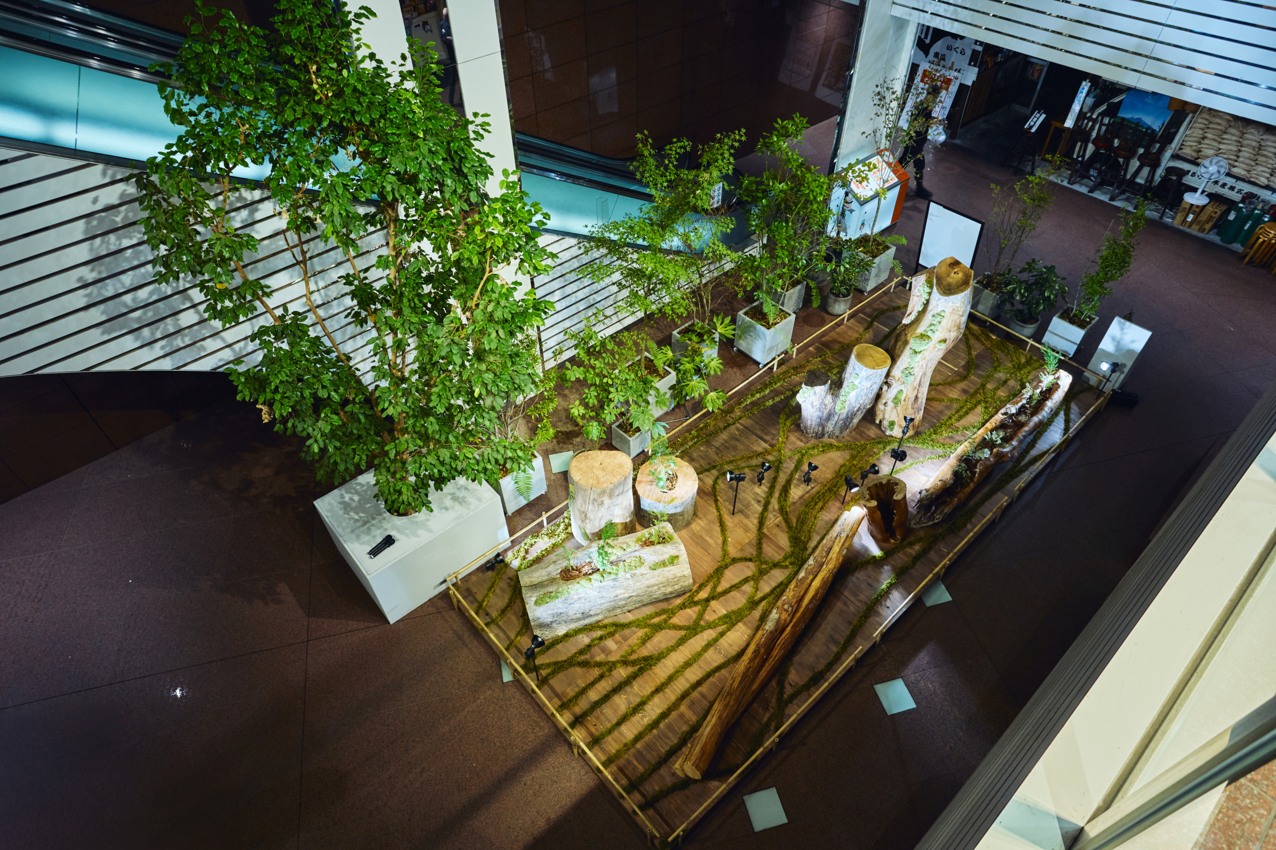秋吉氏は、日本の伝統的な手法である「枯山水」を参照にしながら、その発想を逆転させる。石を組むことで時が止まった姿を鑑賞する枯山水に対して、石の代わりに廃木を採用し変化を促す。そして実際の自然の中では倒れた木がコケに覆われ、そこから新たな命が生まれる「倒木更新」という営みがあるが、それを都市空間で再現しようと試みた。