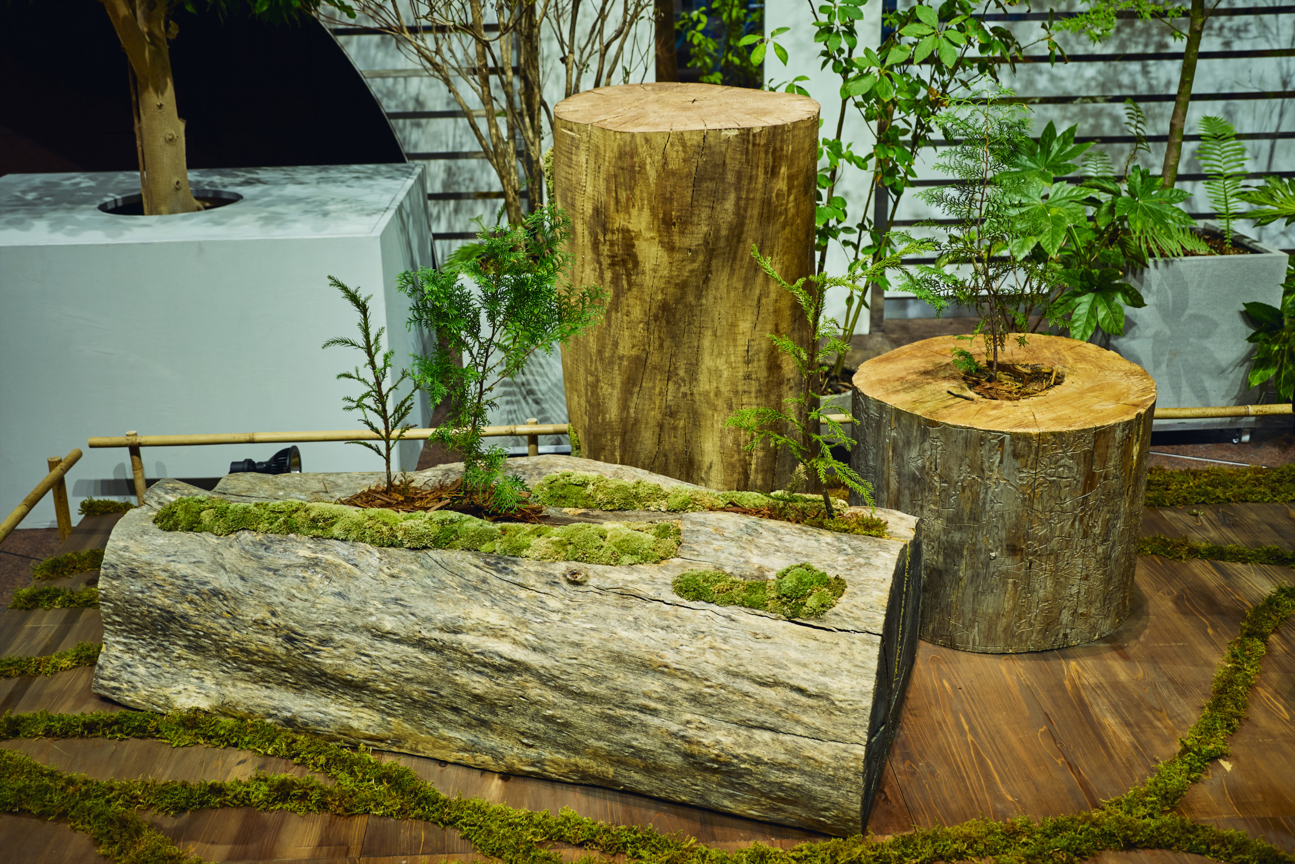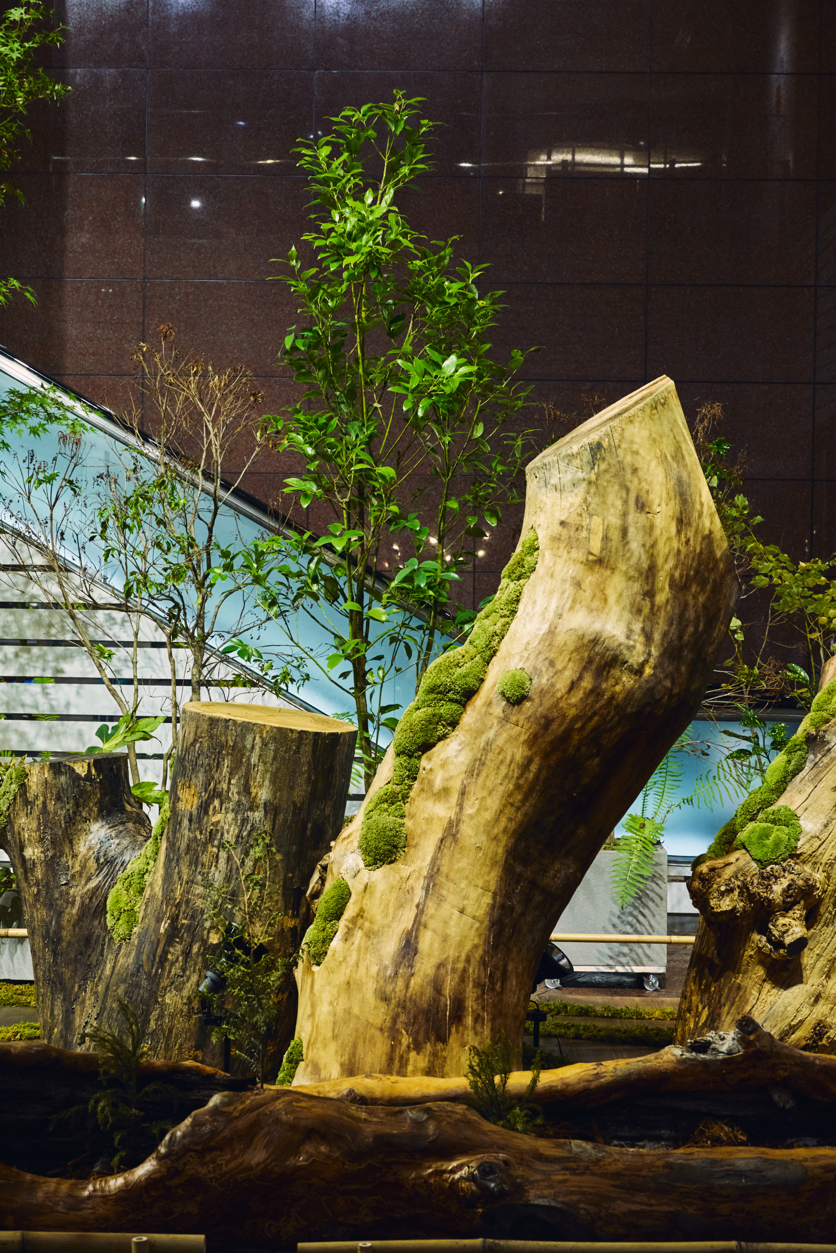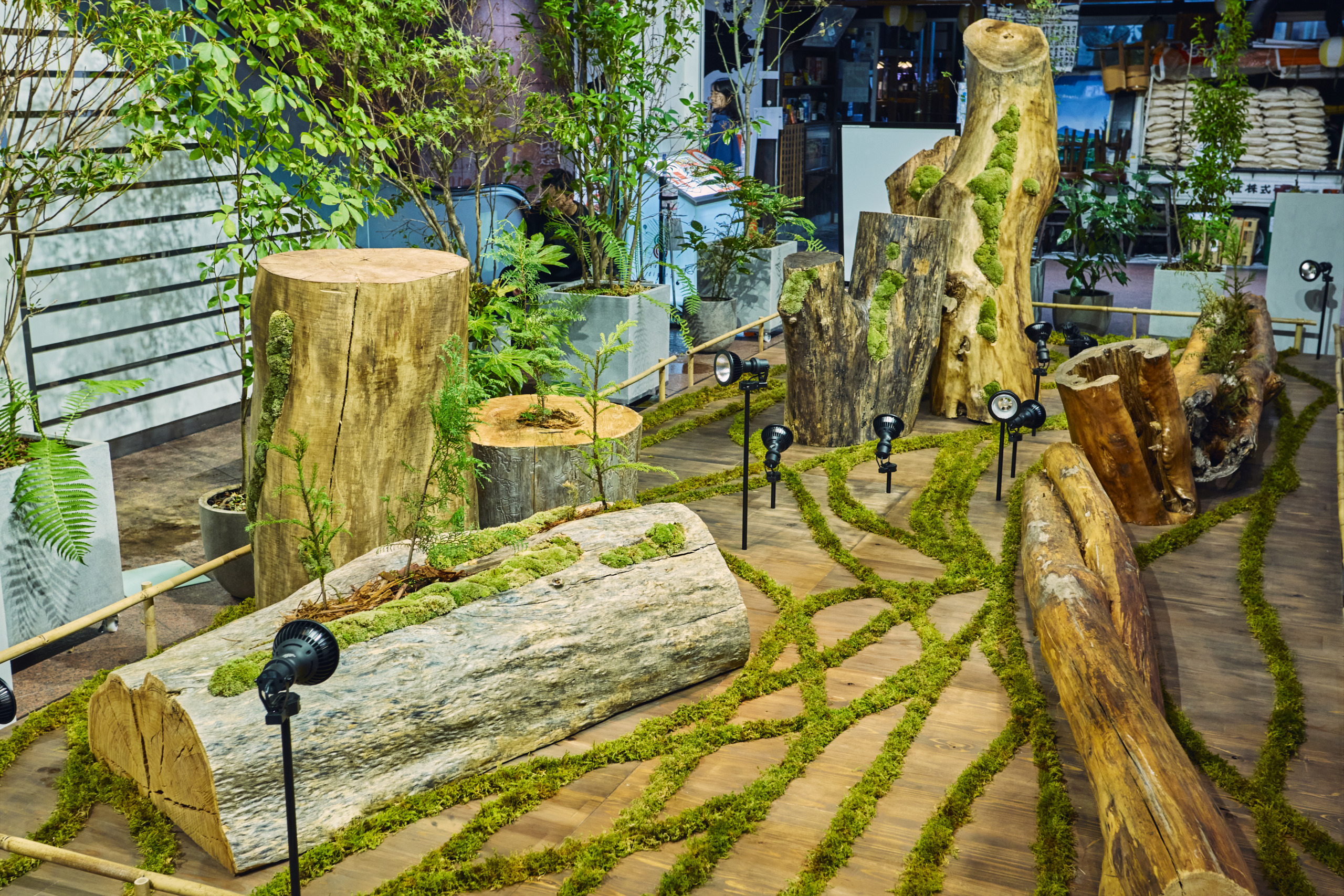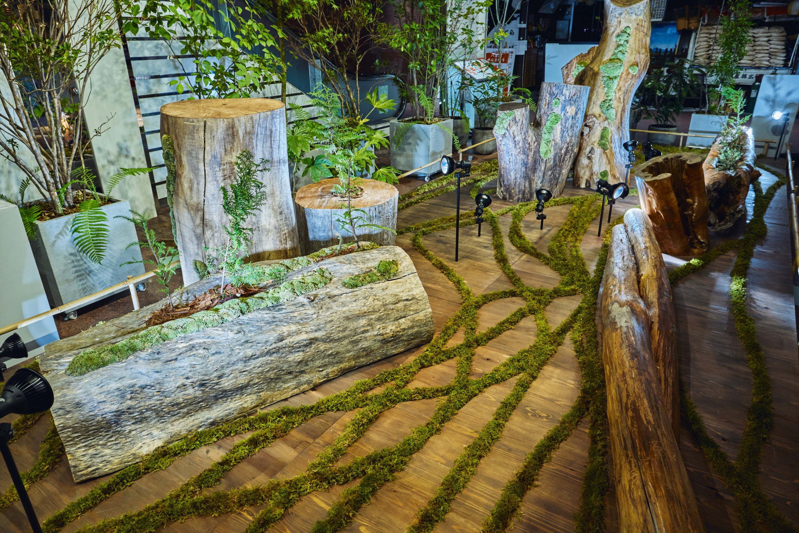 また、立ち木の中に苔を植栽する技術には、ジャパンモスファクトリー独自の技術を用いている。接着面をスパイク状にするといった物理的な仕掛けに加え、化学的な工夫を加えることで垂直な状態での着生を可能にした。「木庭」に設置した照明も、単なるライトアップ目的ではなく、苔の生育に適した植物育成用LEDライトを設置している。