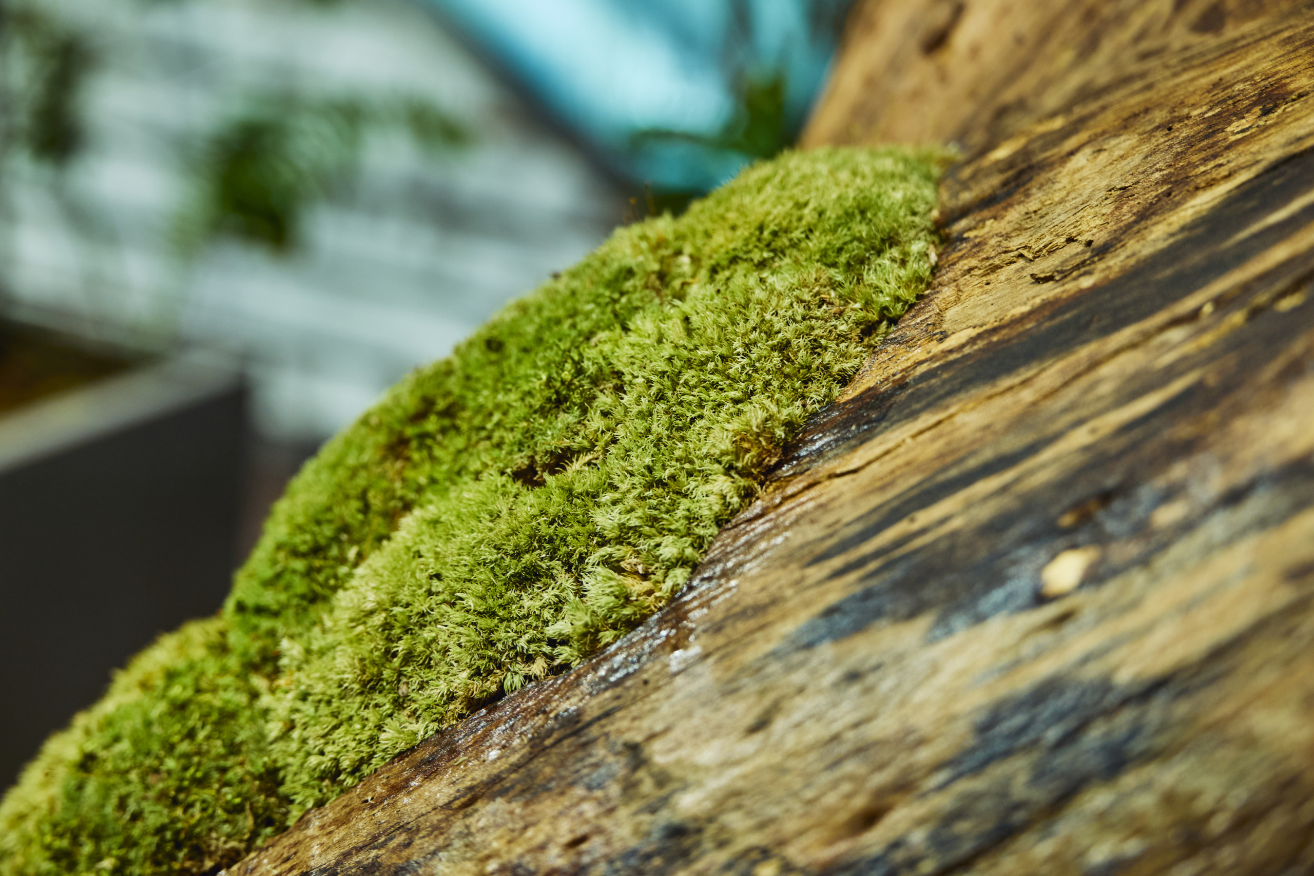 ひとつは、木に着生させた『シラガゴケ(別名:ホソバオキナゴケ)』です。東京の都心はどうしても乾燥してしまうので、乾燥したところにも強いこの苔を選びました。シラガゴケは木材の故郷である檜原村にも群生している種類でもあり、檜原村では杉の木の根元のあたりにたくさん生えています。