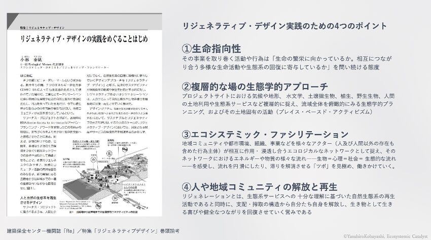 小林氏はリジェネラティブな都市の未来を構想・実践していくためのヒントとして、4つのポイントを示した。