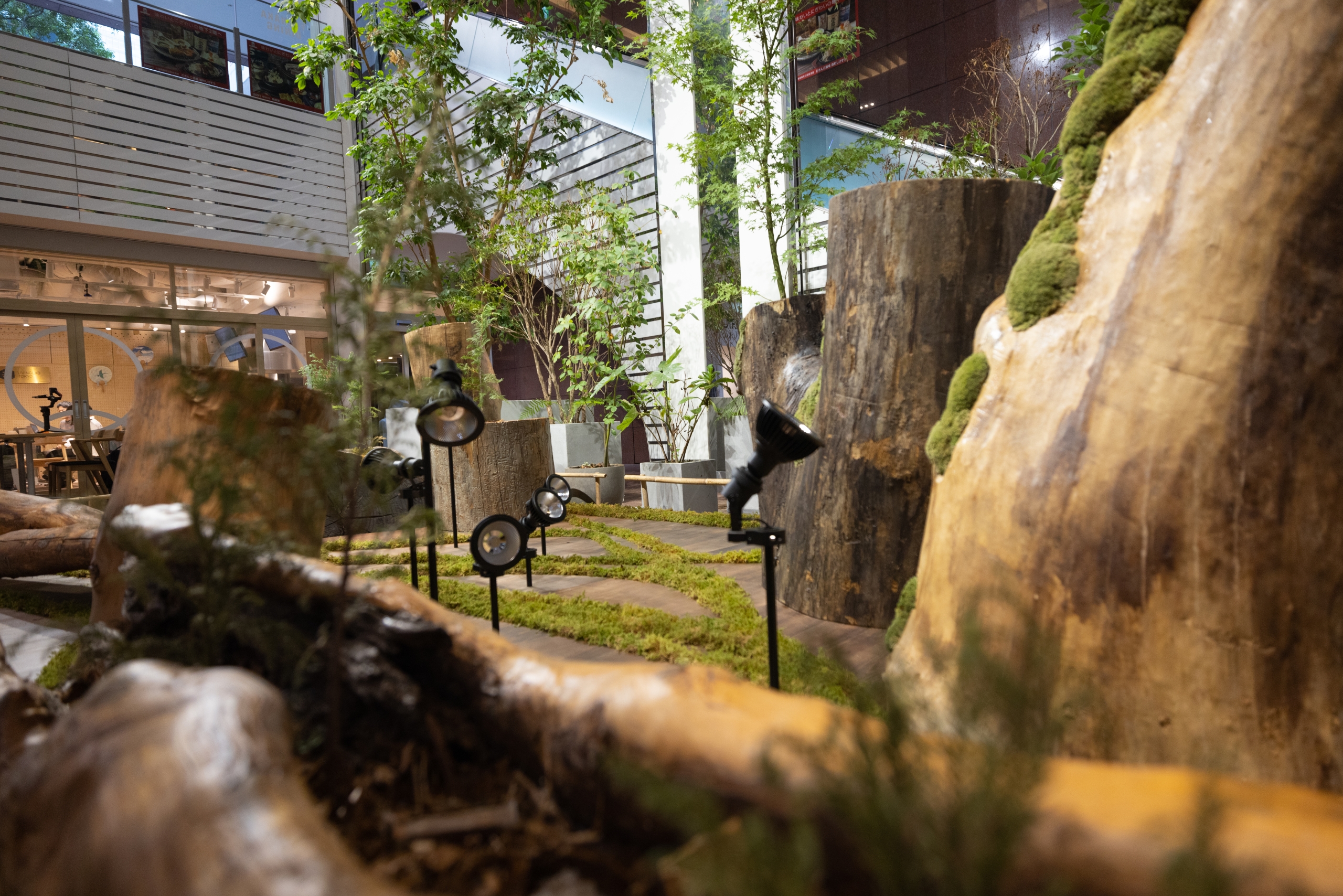 「木庭 MOKUTEI」に利用する木材は、雷で割れたり、2本の木がくっついたりとさまざまな個性を持つ一方で、一般的な木材としては価値が付きにくい木材を採用しています。また、苗木や植栽は木材の原産地である東京都西多摩郡檜原村の生態系を再現したものとなっています。苗木や苔はビルのワーカーや来館者など通行する人々が水を吹きかけることで成長していき、1~2年後には成長した苗木を檜原村の自然環境に植樹することで都市と自然環境の間の循環による森の再生を実現します。また、都市で生活する人々に「都市に居ながら森の再生や生物多様性の保全に貢献する」という新しい自然とのつながりの感覚を提供することで、人々や社会のウェルビーイング向上を図ります。